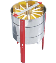 Extracteur radiaire motorisé « TUCANO » récipient Ø 630 mm, avec cage inox à remplissage facilité, pour 20 cadres de hausse Dadant, avec moteur électrique GAMMA à basse tension, et régulateur de vitesse variable entre 0 et 460 tr/min., robinet Ø 40 mm en plastique, trois pieds surdimensionnés et couvercle en plastique.