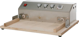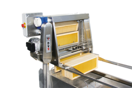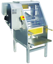 Machine à désoperculer semiautomatique « DV2 » La grande machine à désoperculer « DV 2 » complètement automatique pourrait être surdimensionnée pour certains petits apiculteurs professionnels, par conséquent nous avons étudié cette nouvelle version simplifiée, plus légère et économique mais qui possède néanmoins toutes les caractéristiques de solidité et fiabilité habituelles de nos produits. Le principe de la désoperculation des cadres est exactement le même que celui de la machine plus grande : mêmes couteaux inox dentelés qui oscillent silencieusement, même système de chauffage électrique, même descente motorisée des cadres par chaînes inox. Cette machine aussi permet d'obtenir la désoperculation des cadres « sous bois » en cas d'opercule rentré. Les seules différences sont l'absence de l'alimentation automatique des cadres qui sont donc introduits dans la machine progressivement à travers la goulotte de descente et la structure porteuse qui n'est pas posée au sol mais qui est placée sur un chariot pour machine à désoperculer ou sur des supports adaptés. La DV2 est entièrement en acier inox coupé au laser et usiné selon les règles de l'art. Toutes les commandes électriques sont regroupées dans un boîtier général fonctionnel et complet, avec boutons de commande et de sécurité. Ces machines sont conçues pour les cadres de hausse Dadant mais nous pouvons facilement les adapter aux cadres Langstroth